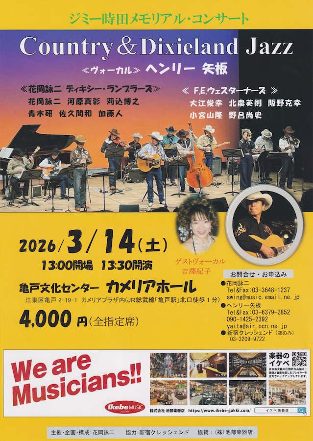 カントリーに対する思い入れは沢山あるしまた強いが、自分が受けた感動、感情を周りの人と、一緒に味わいたいし、私も与えられたらと思っている。まだ、カ ントリー音楽と言う物が、良く解っていませんがこの素晴らしい音楽を皆と価値観を共有出来たら最高の喜びです。また、故ジミ-時田氏に少しでも近づけたら 良いなと頑張っています。