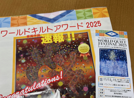 15日、毎年恒例のキルトフェスに行ってきました。今年は会場が小さめ&作品少なめでしたが、ワールドフェスの名の通り外国の作品が多く、お国柄が出ていて面白かったです。